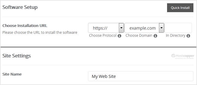 - Choose Installation URL: Choose the appropriate protocol/domain. Inside the "In Directory" field, should you want to install this in a directory, i.e. example.com/directory, enter the directory name. Otherwise, leave it blank to install in your main domain, i.e. example.com