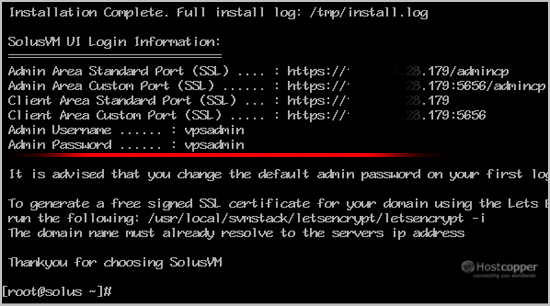 Don't forget to change your default username and password for SolusVM. The default username/password is not secure, and it is easy for anyone to access your panel with them.