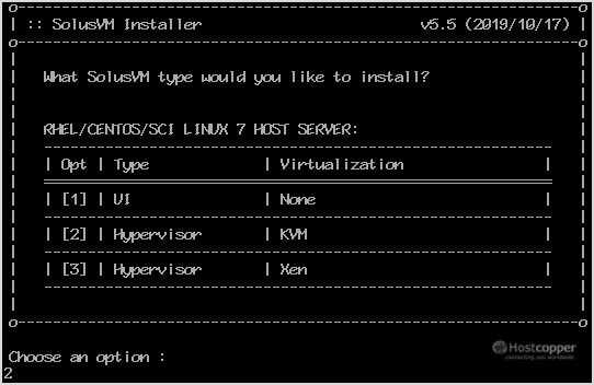 Step 2: It will show you an option to choose virtualization. Most people prefer KVM or Xen. Select your preferred virtualization by typing 1 or 2 and then press Enter. For KVM, we enter 2 and then hit Enter.